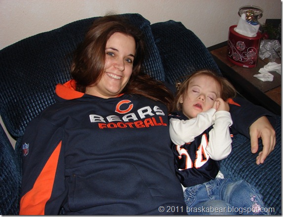 KiKi used to be scared of him, and she used to cry all the time when she saw him come in, but now she plays with him all the time and gets all excited to go see him on Sundays. She loves to cheer for Da Bears with him, too.